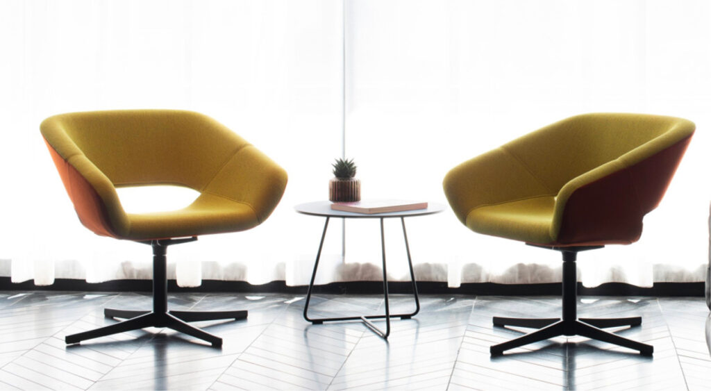 upholstered in different fabrics creating dynamic color combinations. In addition to the bent steel rod frame, the chair is available in a classic four-star base with auto-return cylinder. Both bases are available in black or polished metal.