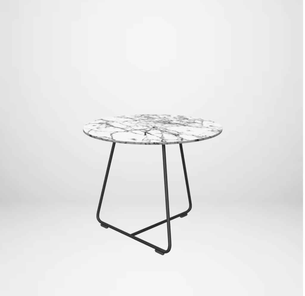 The table is also available with a steel rod base in either matte black or polished metal that can be paired with a tabletop of clear glass, wood, or black or white marbleized solid surface.