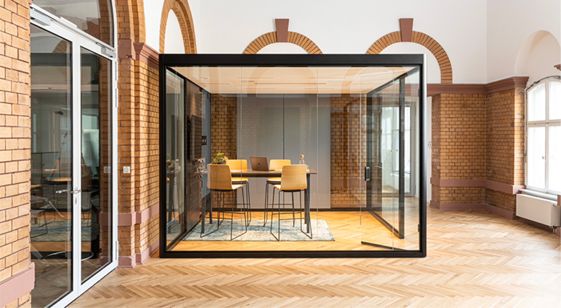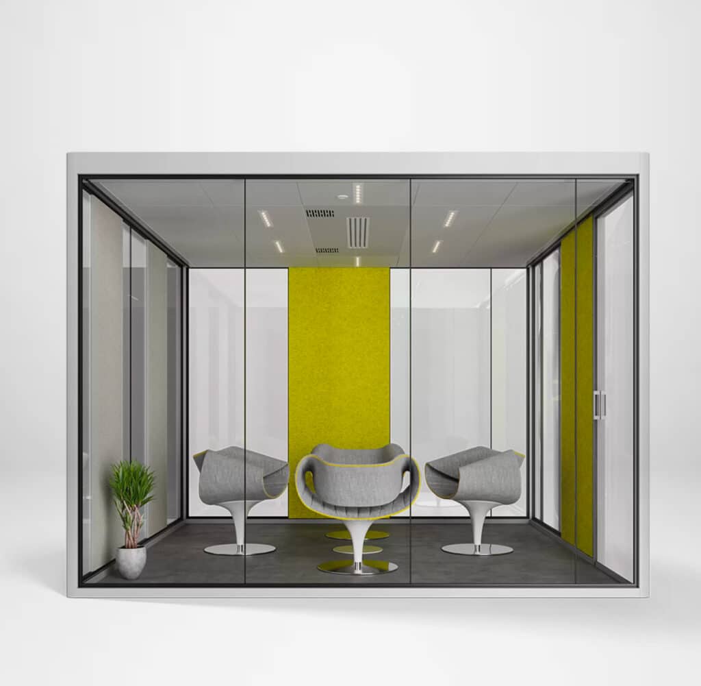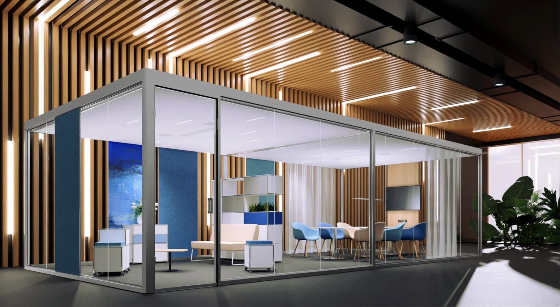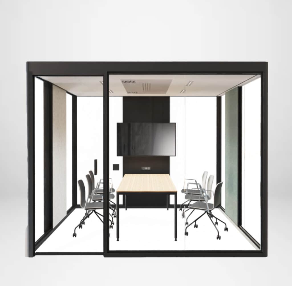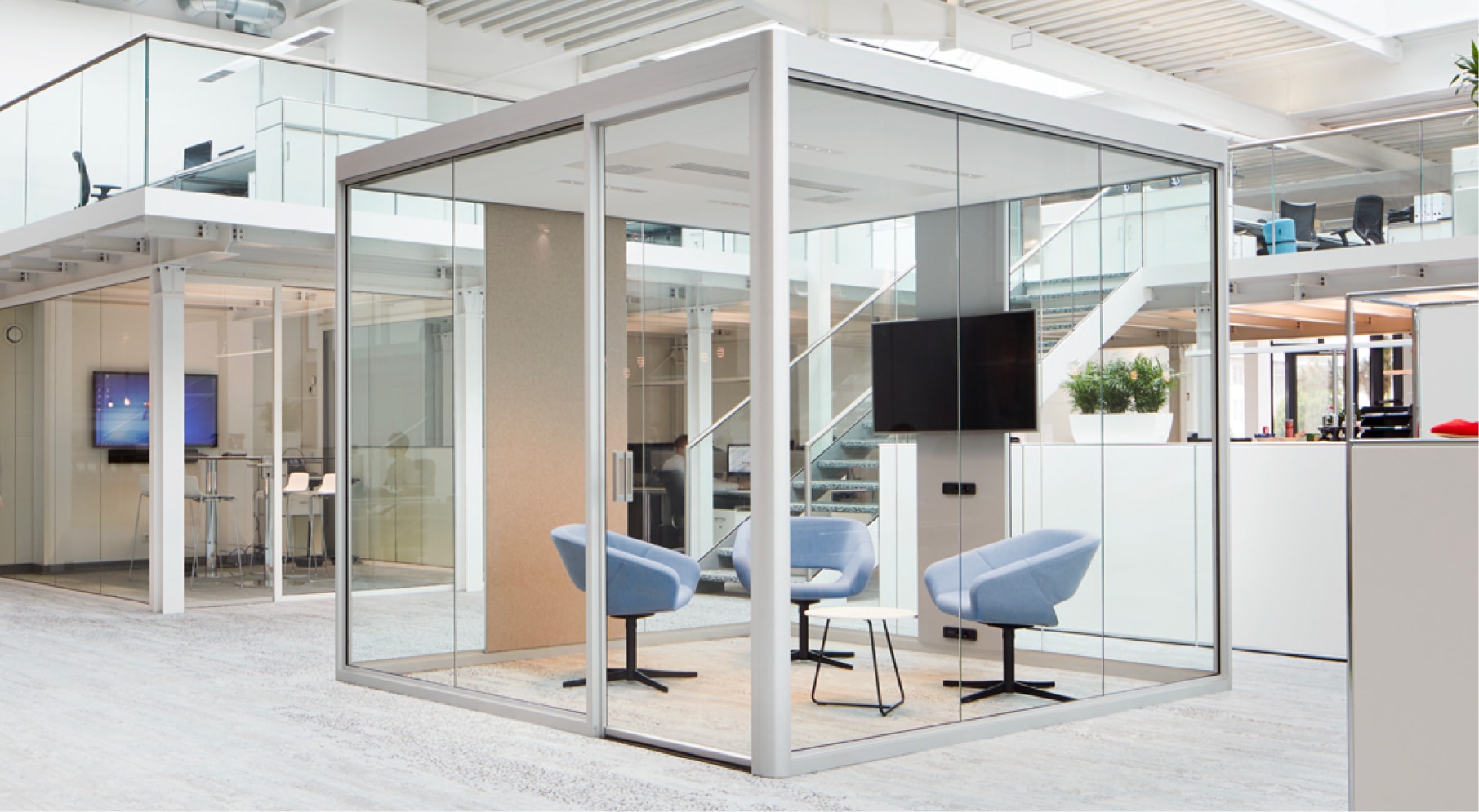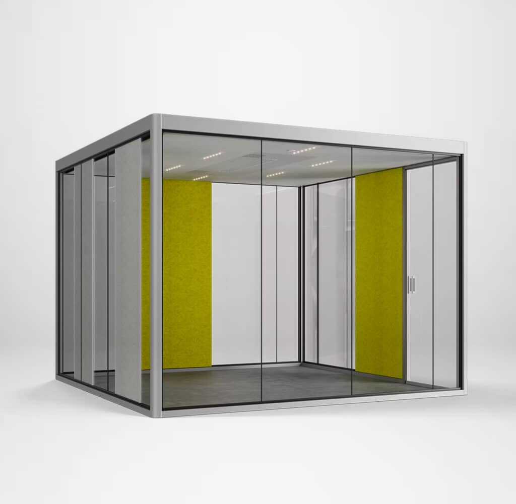 Designed with acoustic privacy in mind, Bosse Room-in-Rooms measure noise reductions of 39 decibels in sound reduction tests. These sleek models are powered by an easy plug-and-play system. Room-in-Rooms can be moved to different locations as needed, and then re-assembled for use the same day.