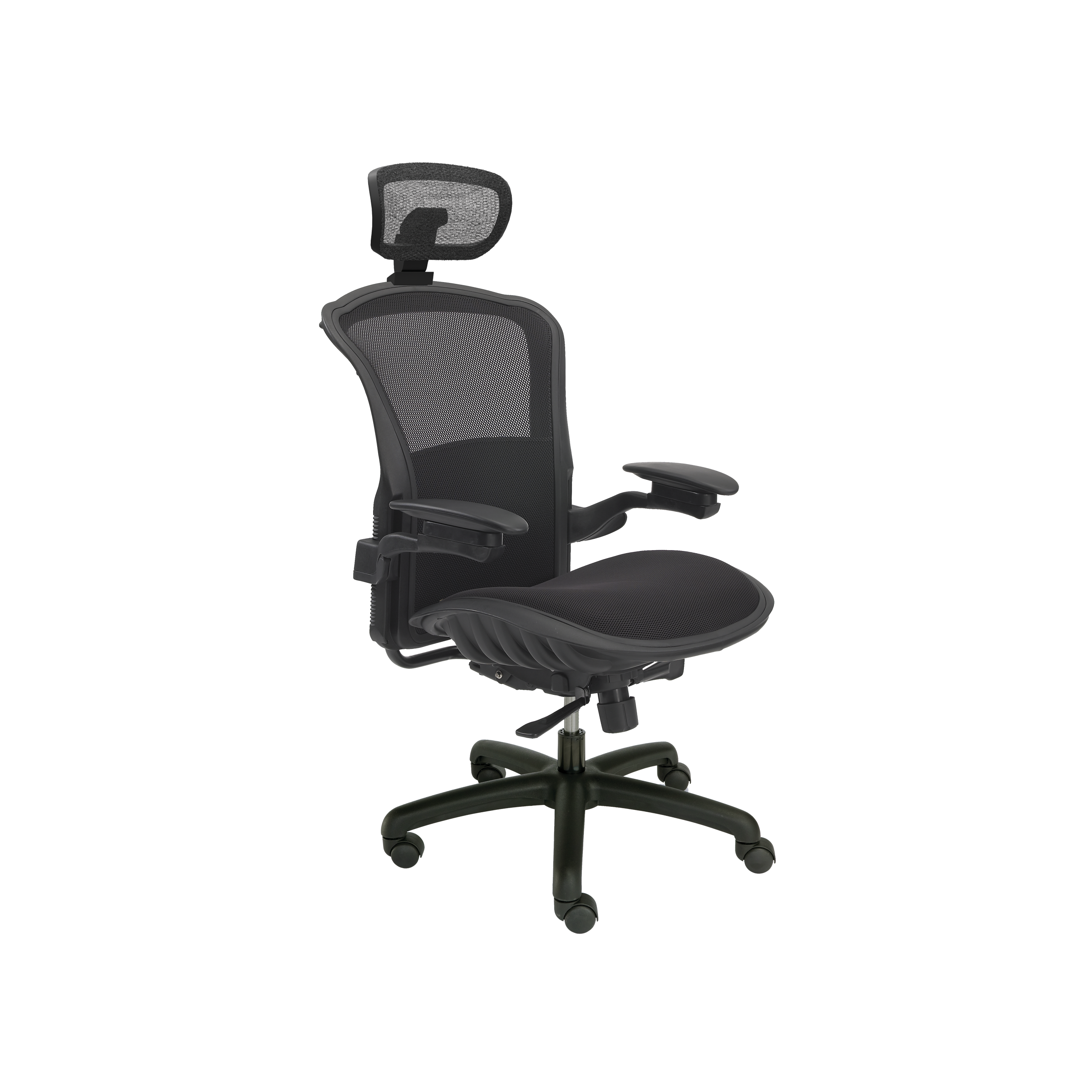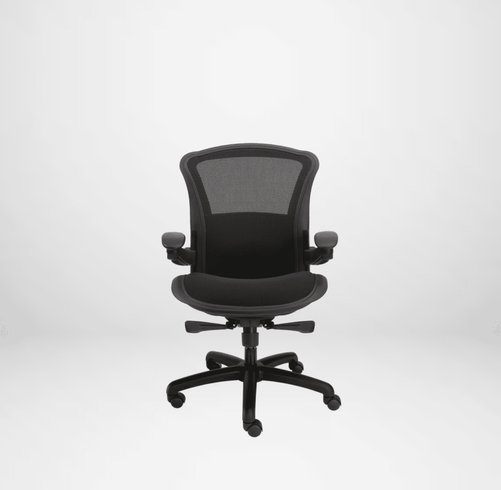 Magnum comes standard with a synchronized seat and back with tension adjustment and multi-position back lock, black mesh back with integrated adjustable lumbar support, height adjustable arms with durable polyurethane pads that can be lowered to seat height, a black nylon five-star base, and hard wheel-free rolling casters for soft surface.
