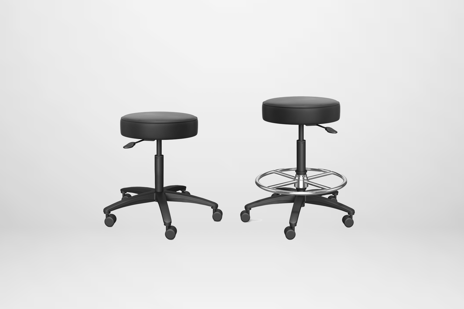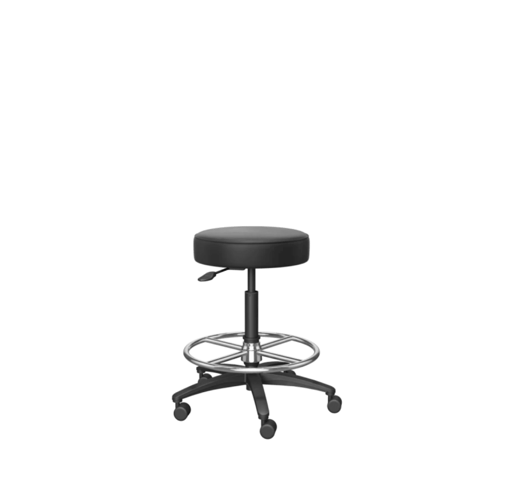 Available in three height options—Desk Chair (17”D x 16-21”H), Medium Stool (17”D x 19-26”H), and Tall Stool (17”D x 23-32”H)—this stool adapts to various medical environments. Its height-adjustable backrest offers a 3-inch adjustment range for optimal lumbar support, while the soft yet durable polyurethane seat and back ensure long-lasting comfort. The stool version includes a 20-inch diameter polished footring, which locks into place with a simple rotation for customized height variation. Supported by a sturdy 27-inch black nylon five-star base, the Dauphin Physician Stool delivers ergonomic support and reliable performance for busy healthcare settings.