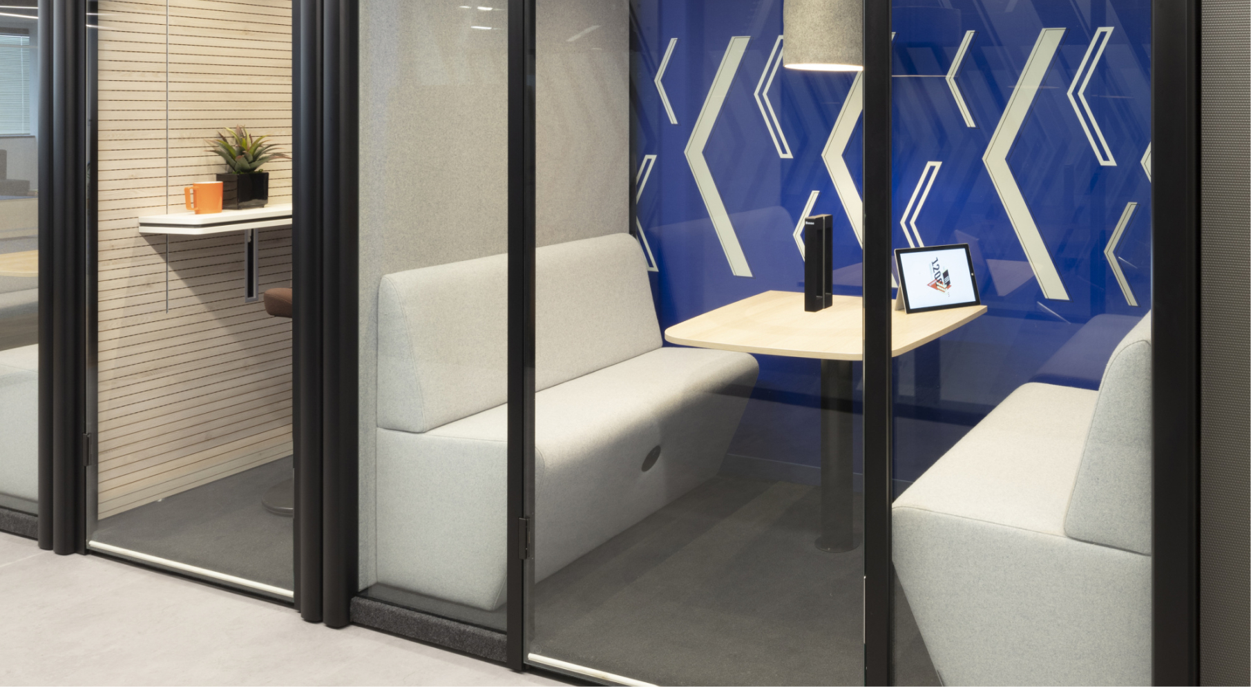 The Dialogue Acoustic Pod offers superior noise-reduction ability and, as shown here, features built-in, upholstered bench seating, peninsula table and pendant lamp.